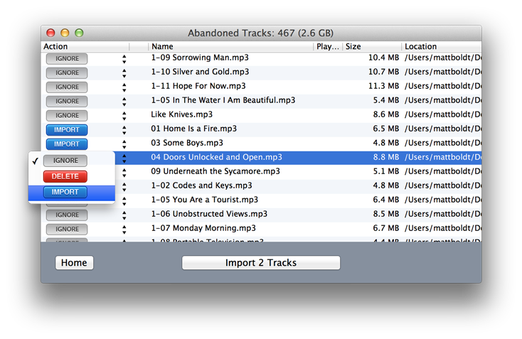 To view these songs that aren't in iTunes, just click on the icon, and you'll see them all listed. By default, the Action column will be set to just IGNORE all of them. To change the Action for any track(s), click on IGNORE, and you'll see the options to also DELETE or IMPORT.
