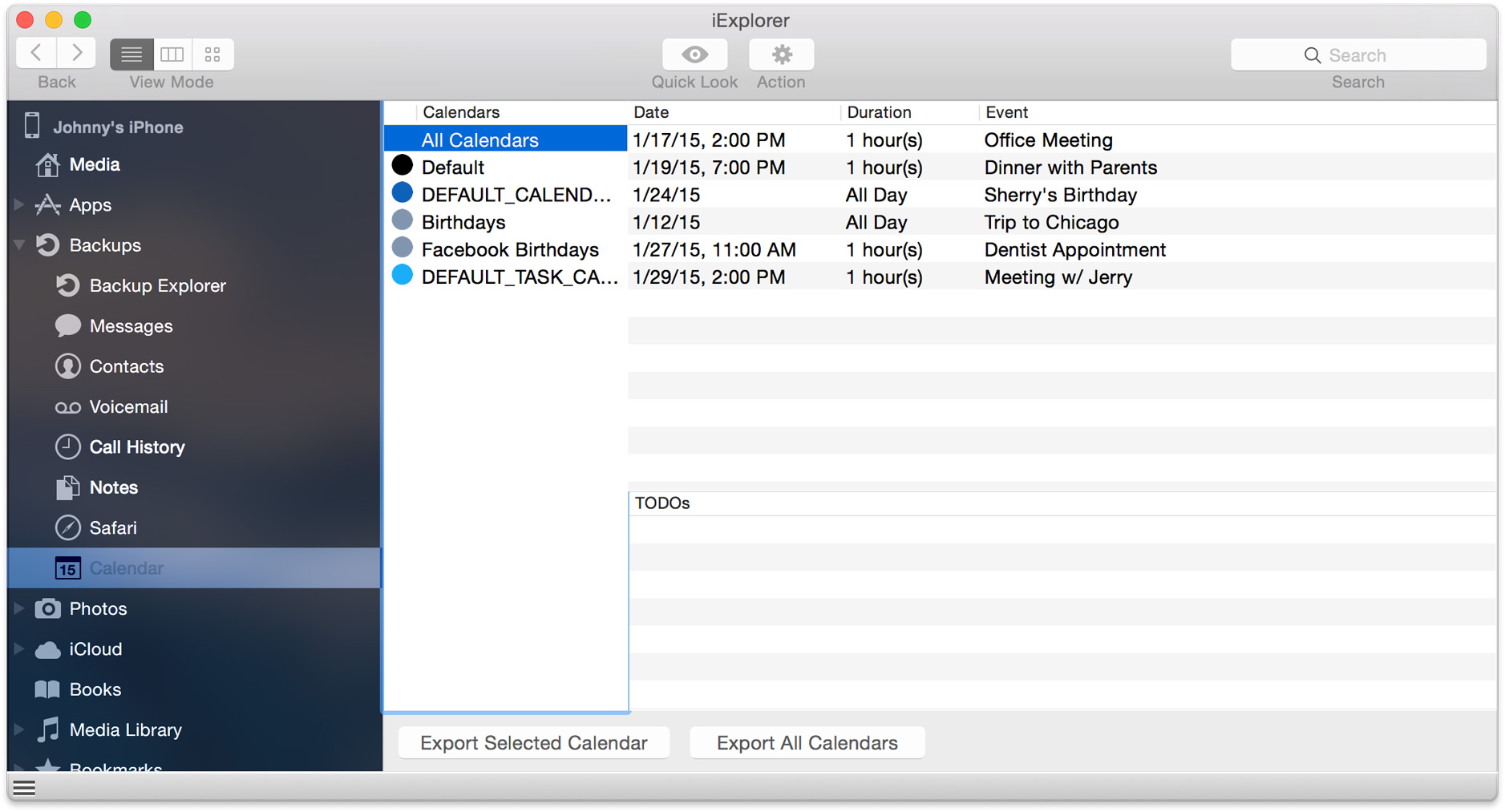 iExplorer can read Calendar data from a connected device or from an iTunes backup.