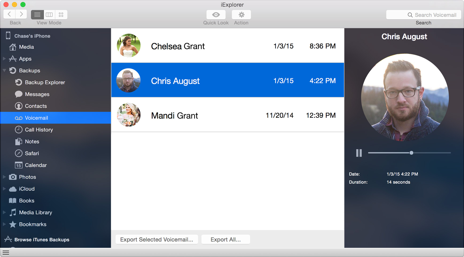 - Once iExplorer has finished loading your Voicemail, you will now see a list of contacts & numbers. Select any of the names or numbers in the list to preview the voicemail. To Export the selected voicemail, click the 'Export Selected Voicemail' button, or you can Export All.