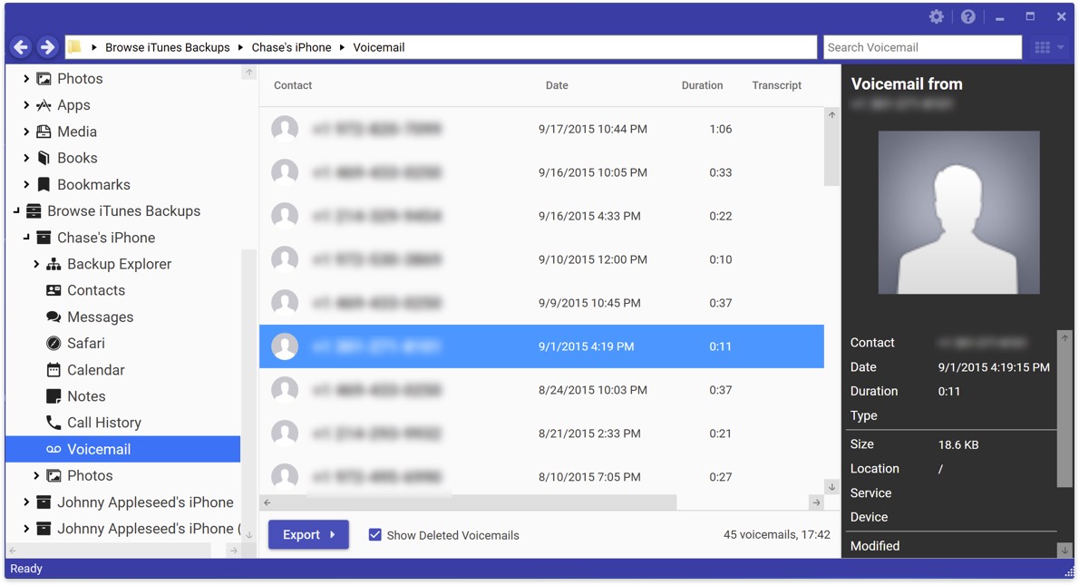 When you create a backup of your iPhone using iTunes, your device's voicemail and other data are saved to your computer, but they get buried deep within various semi-encrypted databases. iExplorer can do the heavy lifting for you and make this database readily available and prettily formatted so you can read and export it on your computer.